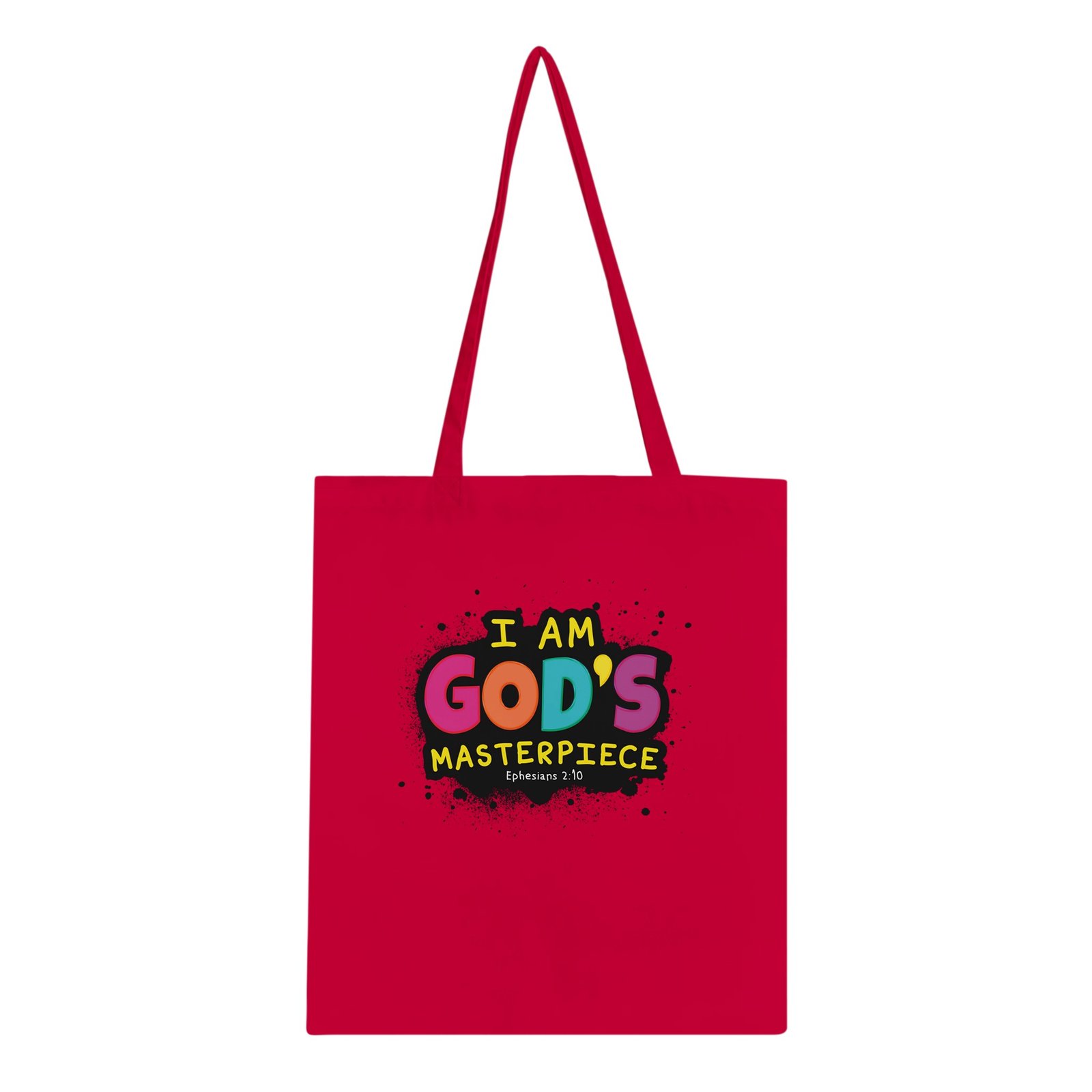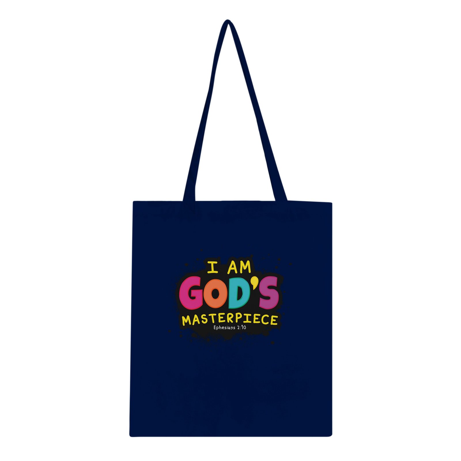 Carry your essentials — and your faith — wherever you go with this “I Am God’s Masterpiece” tote bag, inspired by Ephesians 2:10: