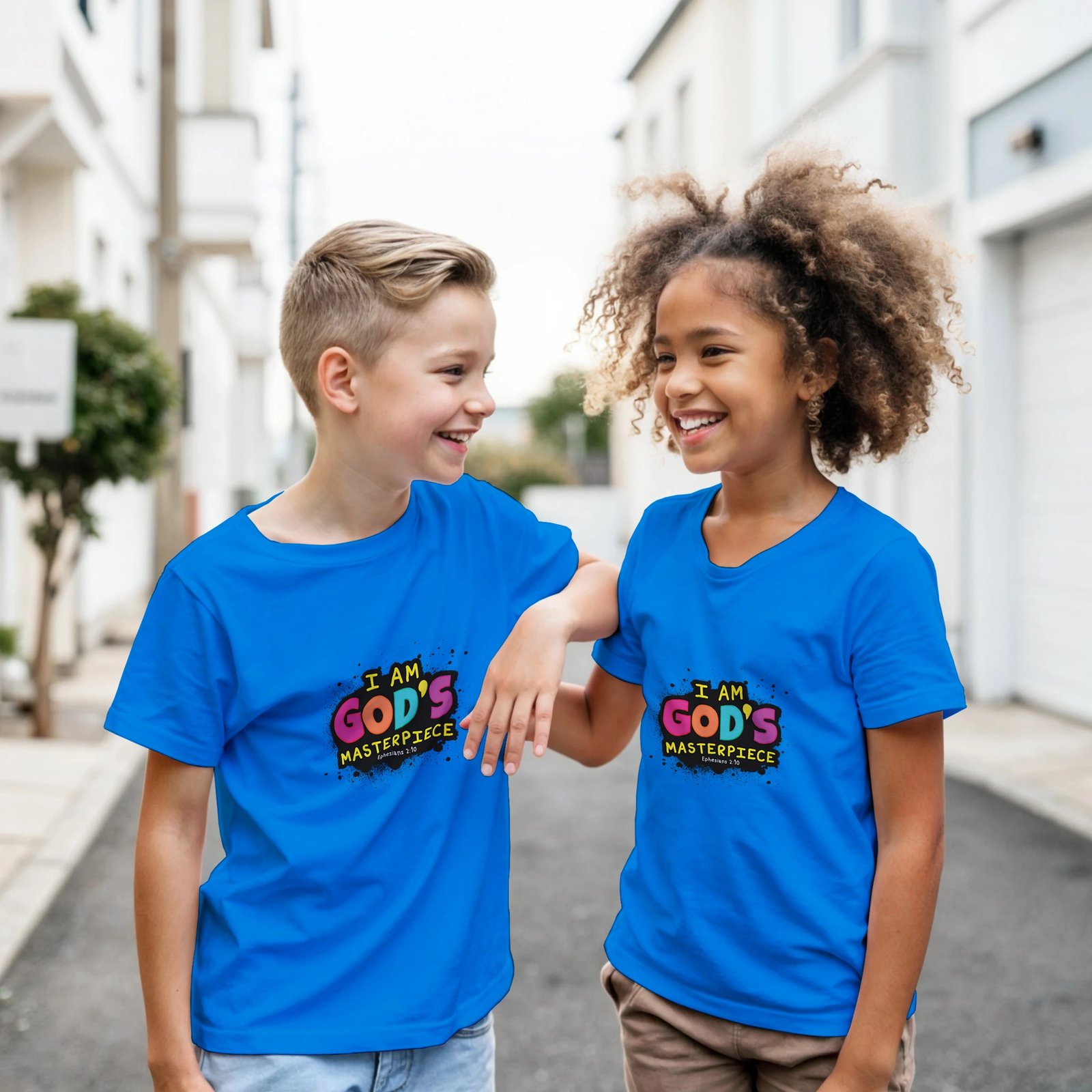 Inspired by Ephesians 2:10 — “For we are God’s handiwork, created in Christ Jesus to do good works” — this soft, durable T-shirt helps children wear their faith with confidence and joy.