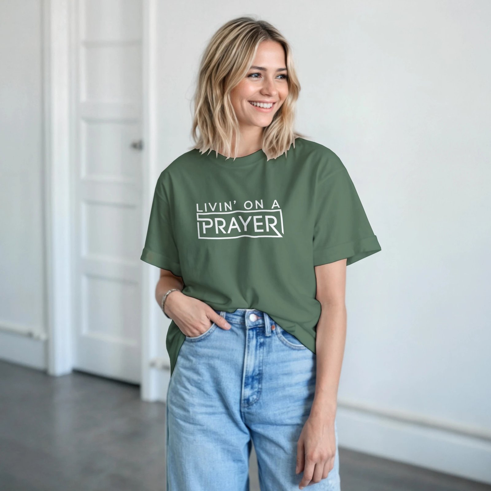 This shirt isn’t just style — it’s a statement. A perfect gift for anyone who knows that faith isn’t a Sunday thing; it’s an everyday walk. Personalize your message of faith by selecting from a spectrum of 12 vibrant colors, including classic White, earthy Military Green, deep Navy, or rich Cardinal Red. Find your perfect fit, available in sizes from S up to 5XL. Craft your ideal expression of devotion and order your “Livin’ on a Prayer” tee today!