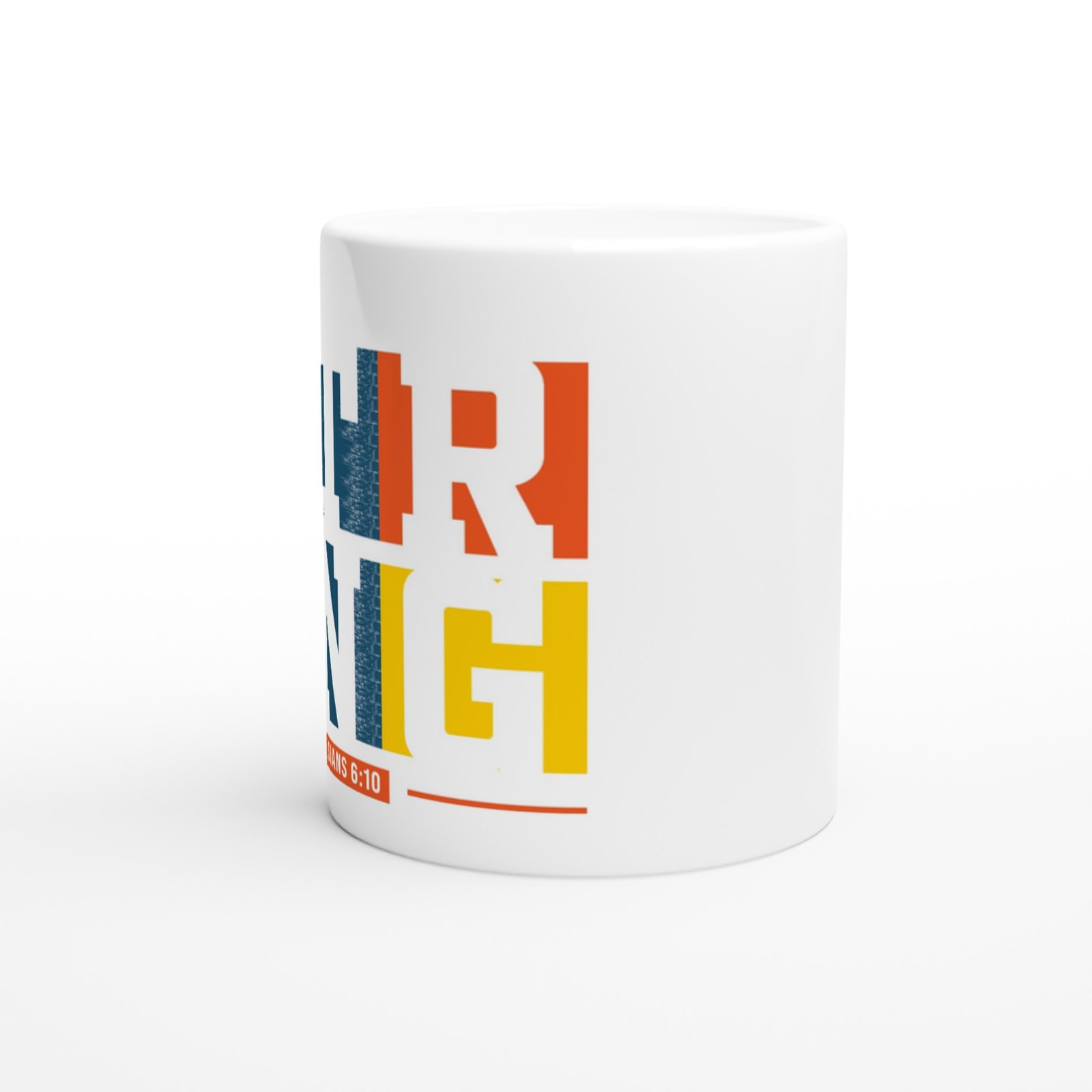 Crafted with a glossy white finish, this mug brings Scripture-inspired encouragement to your every sip.
